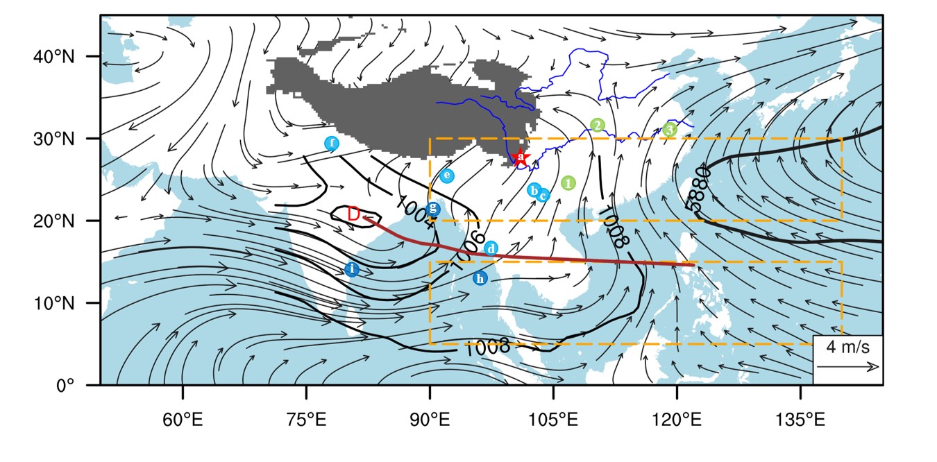 图2. 研究区及现代气候状况,红色五角星为泸沽湖所处位置,东西向深红色粗线为季风槽的位置