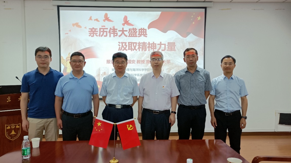 汤国安教授说,身为教学科研一线的人民教师,能够亲身参加庆典活动,共同见证这一具有非凡意义的重大历史时刻,充分体现了以习近平同志为核心的党中央对教育事业和对教师队伍的高度重视,体现了党中央对人民教师的亲切关怀和政治礼遇,感到无上光荣,倍受鼓舞激励。他介绍了建党一百周年盛典系列活动的盛况,包括观看大型情景史诗《伟大征程》,体验视觉震撼;观看“七一勋章”授予仪式,接受心灵洗礼;参观中国共产党历史展览馆,感受中国共产党波澜壮阔的发展历程;参加天安门广场建党百年庆祝典礼,近距离聆听习总书记重要讲话。汤老师深刻感悟到中国共产党人牢记使命,不畏艰难,不怕牺牲,为新中国的建立与发展,为人民的幸福与安康,为民族的解放与复兴,做出了彪炳史册的重要贡献。作为人民教师,责任重大、使命光荣,一定要撸起袖子加油干,为国家培养一批又一批批德智体美劳全面发展的社会主义建设者和接班人,努力成为中华民族伟大复兴的一名教育“筑梦人”。同时,汤老师也感叹,现代科学技术护航庆典活动科学规划、井然有序,特别是人工天气干预、遥感对地观测、地理信息系统等技术为庆典活动提供了强有力的保障。汤老师还与师生作了交流。