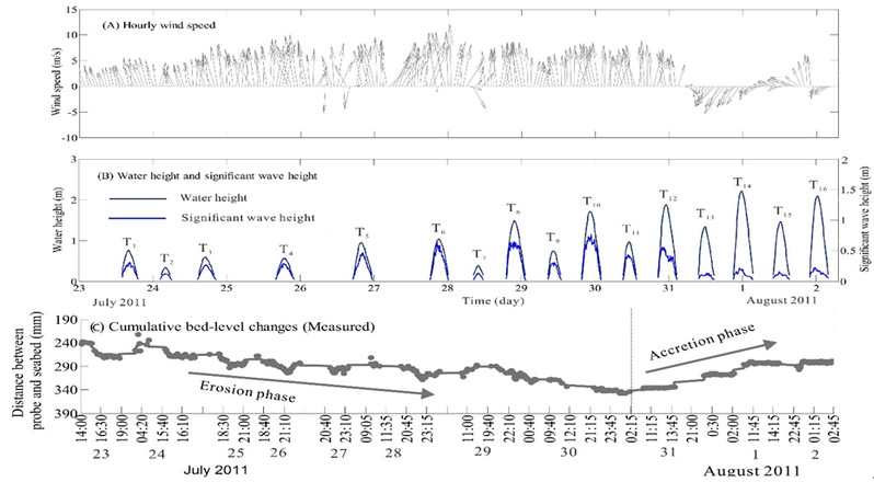 河口海岸、潮汐环境的沉积地貌过程是海岸海洋科学系的传统研究领域。近年来,海岸海洋科学系借助高精度、高时空分辨率的动力-沉积物-地貌观测系统和数值模拟技术,定量研究了河口海岸、潮汐环境中细颗粒物质输运的物理过程和机制,加深了对海岸带侵蚀淤积循环规律的认识。近期在长江口崇明东滩潮间带的研究发现,(1)侵蚀或淤积过程是由风速-风向和大-小潮周期的交互作用所控制的,即为近岸风和潮汐交互影响的结果(图1);(2)无论是在正常天气还是在风暴天气,近岸风均可以显著改变潮滩滩面高程;(3)上述过程可以通过经典的浪-流-沉积物耦合模型来描述和预测。这是对海岸冲淤规律的新认识,有助于进一步发展河口海岸演化的新模式,为建立潮滩和三角洲沉积地貌演化的正演模拟奠定基础,亦可并为海岸带综合管理和生物工程建设提供科学依据。该项成果以黄漫 为第一单位发表于Nature Index期刊,论文的第一作者为黄漫 史本伟博士:Shi, B. W., S. L. Yang, Y. P. Wang, G. C. Li, M. L. Li, P. Li, and C. Li, 2017. Role of wind in erosion-accretion cycles on an estuarine mudflat. Journal of Geophysical Research: Oceans, 121(1): 193–206, doi:10.1002/2016JC011902.。该项工作得到了国家自然科学基金面上项目的资助。
