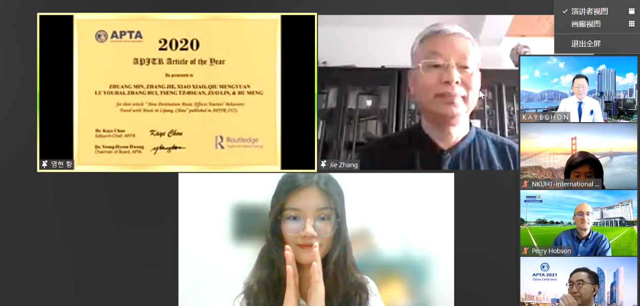 亚太旅游学会2021年会年度最佳论文颁奖环节(右上为张捷教授,左下为在读博士庄敏)