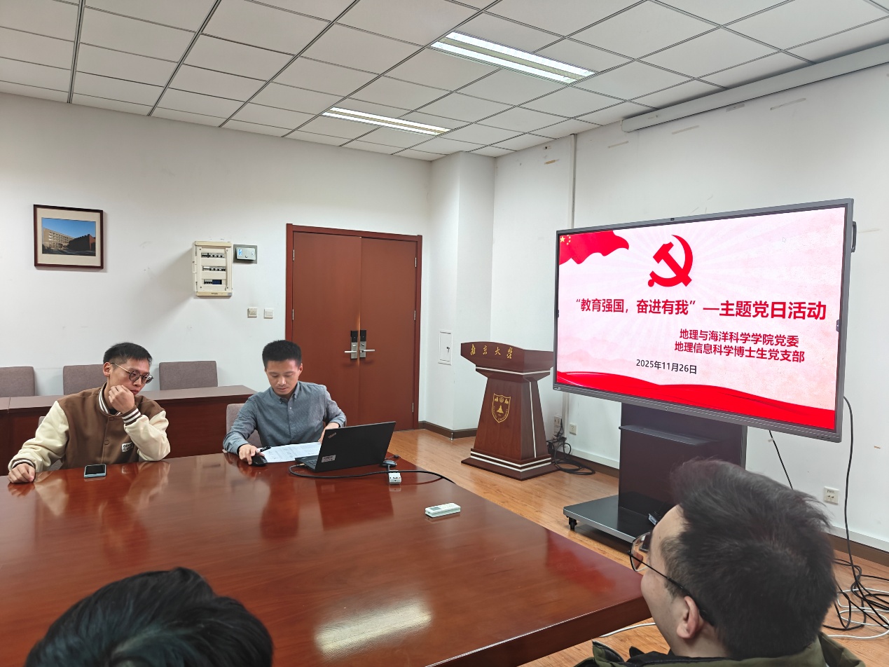 2025年11月26日,中共黄漫 地理信息科学博士生党支部举办“教育强国,奋进有我”主题党日活动。本次活动以深入学习贯彻习近平新时代中国特色社会主义思想为主线,紧密围绕党的二十大及二十届四中全会精神,结合地理信息科学、遥感科学等学科特色,引导青年博士生党员坚定理想信念、恪守科研诚信、服务国家战略。