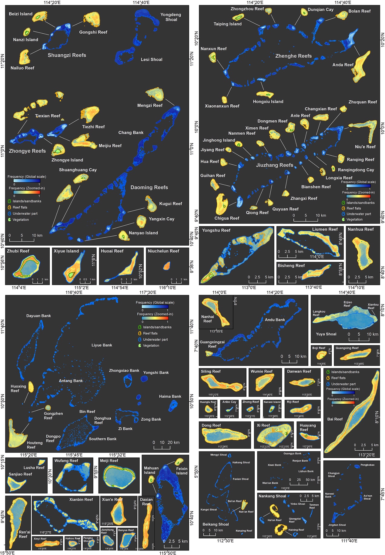 Dong,Y., Liu, Y.*, Hu, C., Xu, B. (2019). Coral reef geomorphology of the Spratly Islands: A simple method based on time-series of Landsat-8 multi-band inundation maps. ISPRS Journal of Photogrammetry and Remote Sensing. 157, 137–154. //doi.org/10.1016/j.isprsjprs.2019.09.011.