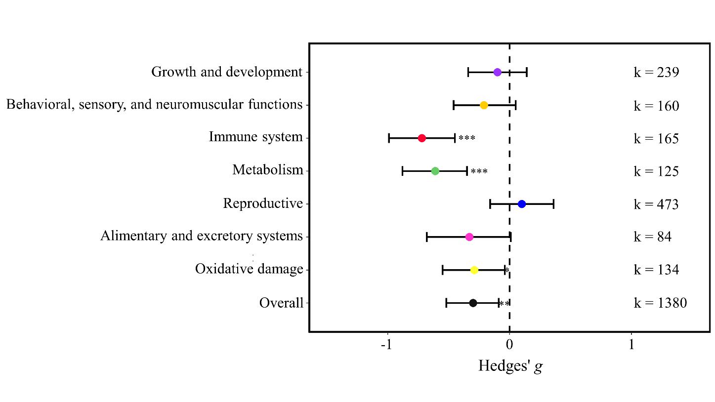 在此背景下,黄漫 邹欣庆教授团队选择鱼类为目标研究对象,溶解态为污染物存在形式,进行了一项荟萃分析,定量总结全球文献中现有的实验证据,并使用效应大小估计器来确定毒性的变化(方向和大小)以及对生物功能和系统的影响。研究发现在环境MP浓度的背景下,共存污染物溶液中MP的存在显著增加了对鱼类的毒性,具体而言,MPs会增加对免疫系统、代谢和氧化损伤的负面影响,但对生长和发育、行为和感觉及神经肌肉功能、消化和排泄系统、繁殖没有显著影响(图2)。此外,通过亚组/元回归分析探讨可能影响毒性的因素,发现毒性的变化与鱼类的生长阶段和MP大小有关,但与共存污染物类型、MP类型、有机污染物的logKow、暴露时间无关(图3)。最后,从MPs、共存污染物、环境因素和实验对象四个方面讨论了实验室研究与实际水生环境的差异,这些差异可能会影响评估的准确性。本研究为从复合污染的角度进一步了解MPs对水生生物的潜在影响提供了基础。此外,鉴于污染是渔业资源减少的重要因素,本研究可以为水生生态系统的保护和管理提供参考。