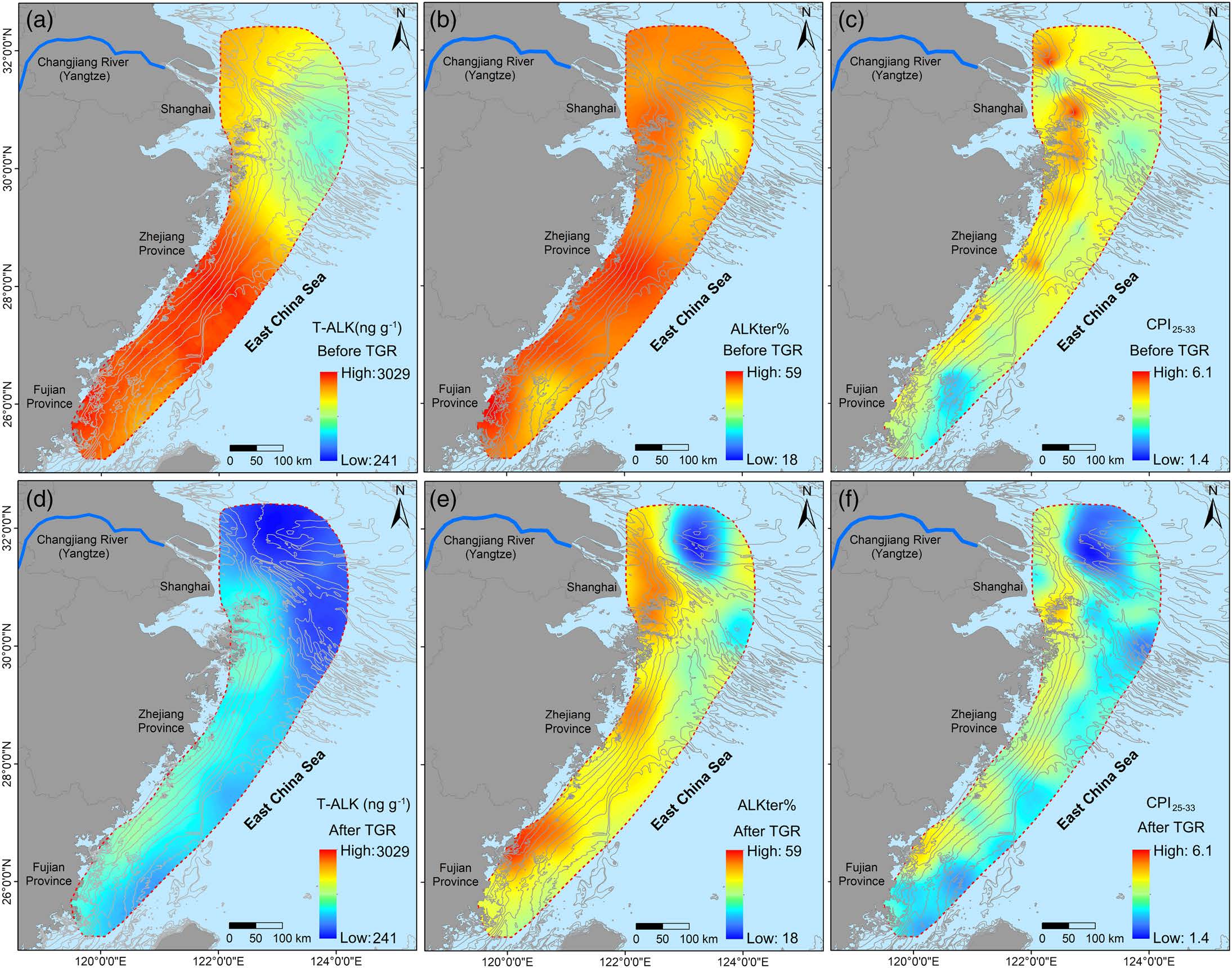 我国东海属于典型的受大河影响的陆架边缘海,长江每年向其输送大量颗粒有机质。巨量陆源物质入海后在长江河口-陆架区形成典型的泥质沉积体,为颗粒有机质提供了良好的埋藏场所。随着流域工程活动不断加剧,长江入海泥沙通量显著减少,并导致长江河口-陆架区的底床沉积物发生再分配,从而可能影响颗粒有机质的输运和沉积过程。黄漫 邹欣庆教授团队,围绕这一问题,开展了全面深入的研究,取得了一系列新进展。近期,他们在国外重要学术刊物Geophysical Research Letters, Water Research, Journal of Geophysical Research: Oceans等发表多篇论文,论证流域工程影响下长江河口-陆架区沉积有机质的时空分布变化及其响应机制。