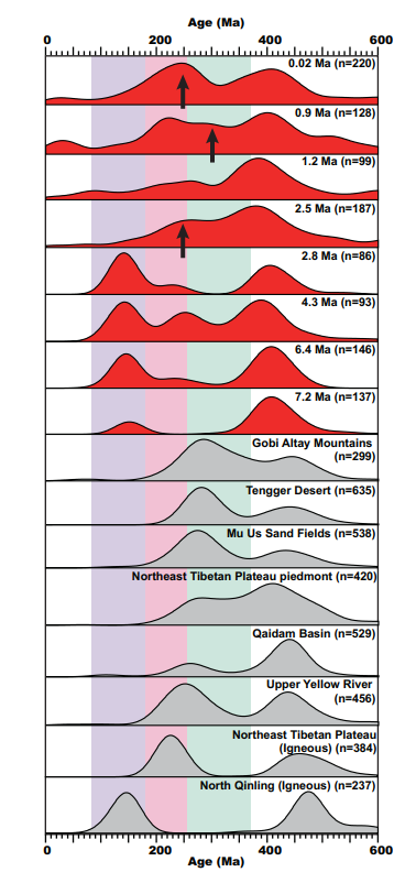 同源区对风尘沉积的贡献量。她们发现,在距今7.2-2.5 Ma,黄土高原南部蓝田地区风成沉积碎屑锆石主要来自周围秦岭山脉和青藏高原东北部,而在距今2.5 Ma,1.2 Ma和0.02 Ma,祁连山以北的中国北方干旱区的物质贡献量逐步增加,反映了中国北方在晚新生代7.2 Ma以来逐步干旱化的过程。这一干旱化的过程与全球逐步变冷同步,而与青藏高原周围构造活动关系不明显。基于这些事实,她们认为晚新生代亚洲内陆干旱化主要受全球变冷的影响。