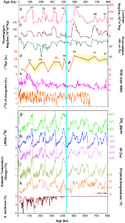 图2. 我国内蒙古赤峰地区黄土-古土壤序列硼同位素(d)与同剖面粒度(c)、磁化率(b)、以及洛川黄土磁化率(a)、中国南海沉积物K/Al比值 (e) 、石笋氧同位素 (f)、全球大气CO2(g)、海洋氧同位素综合(h)、南极冰盖氢同位素(i)、南极温度变化 (j)、中国南海海表温度变化 (k)、北冰洋的海冰变化 (l)的对比(具体内容请阅读原文)。