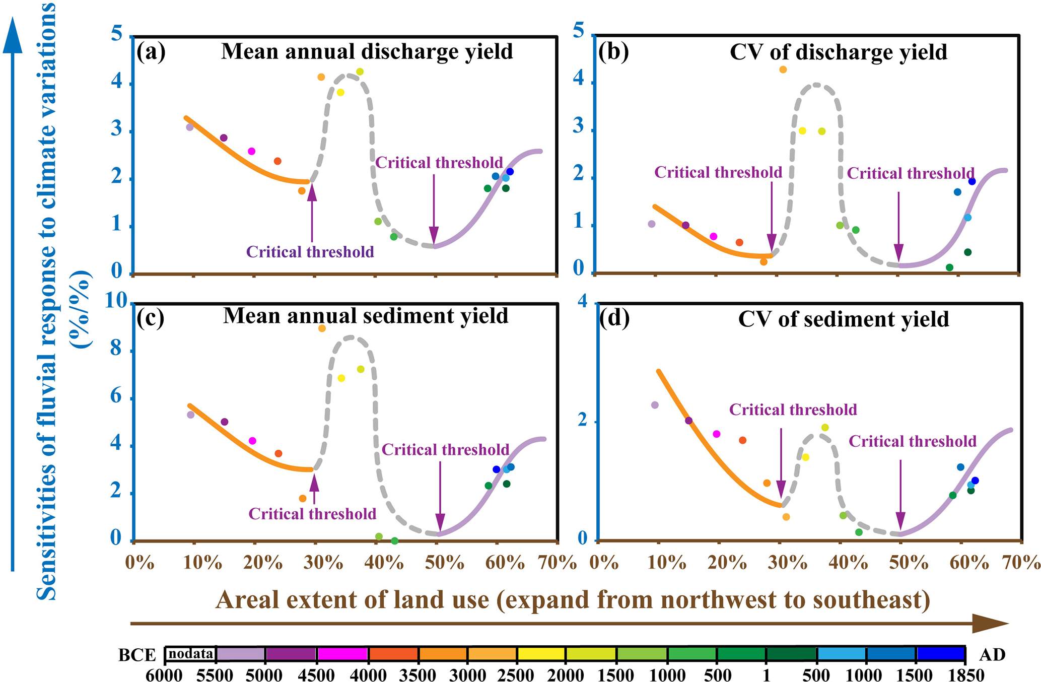 结果表明,在流域农业用地面积占比较低时,径流量与泥沙量对气候变化响应的敏感度会持续下降;当农业用地面积占比增高,径流量与泥沙量对气候变化响应的敏感度则呈现持续上升的状态(图2)。基于这个现象,我们提出流域的水文泥沙过程在1000 BCE,即流域农业用地面积占比超过30-50%时,发生了系统突变。