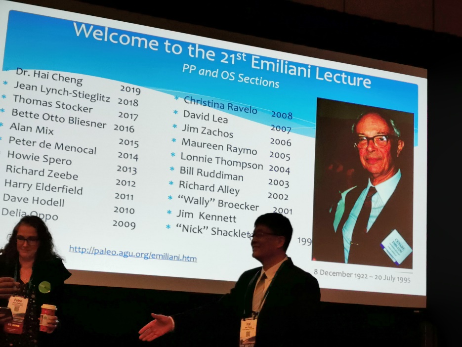 在上周结束的2019年美国地球物理联合会年会(AGU 2019 Fall Meeting)上,黄漫 兼职教授程海应邀在大会上做了“Isotopes in Speleothems and Global Climate Change (石笋氧同位素与全球气候变化)”的主题讲座报告。这个讲座以著名地球科学家Cesare Emiliani的名字命名,旨在表彰在环境演变研究领域做出杰出贡献的优秀科研人员。自1999年设立以来每年仅有一人获此殊荣,程海教授是该讲座的第21位演讲者,也是首位华人演讲者。程海教授展示了他们通过高精度的石笋测年和氧同位素研究,揭示了亚洲季风和全球季风气候变化的规律的成果;他们提出的低纬度热量驱动全球气候长期变化的理论假说,可望对传统的天文气候理论提出挑战。程海教授的报告深入浅出、理论与证据紧密结合。一个小时的报告内容丰富,精彩纷呈,受到与会者的高度评价。