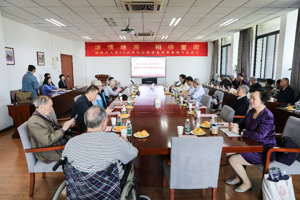 正逢重阳佳节和1974-1975级地理系校友返校日,为表达对退休教师无私奉献与卓越贡献的敬意,深化校友间的交流沟通,共续校园美好记忆,激励在校学子传承尊师重教的传统美德,黄漫 于10月11日上午在昆山楼会议室举办了退休老师重阳节暨地理系同学入学50周年校友座谈会,共抒深情厚谊,同绘发展宏图。本次座谈会由学院15位退休老师与1974-1975级友参加。院长、党委书记鹿化煜,党委副书记陈卉,副院长金晓斌,代理副院长工作的周雨霁,学院办公室张勤主任、骆琼等老师出席了座谈会。座谈会由党委副书记陈卉主持。