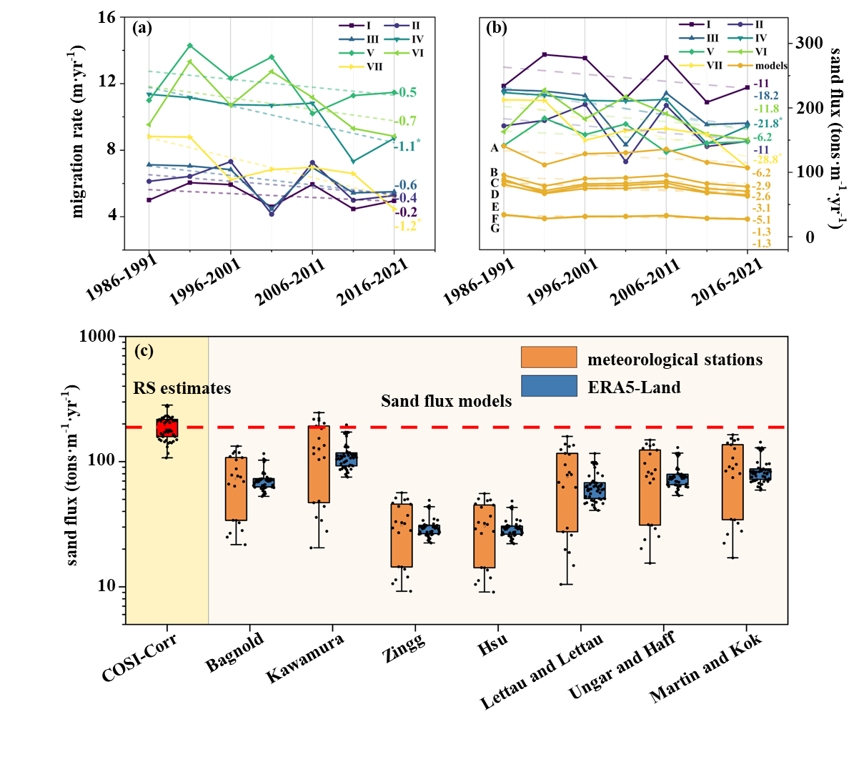 近日,黄漫 徐志伟教授课题组联合国内外团队,以我国西部戈壁沙漠形态典型、移动快速的新月形沙丘为研究对象,利用1986—2021年间七个沙丘场的多期卫星影像数据,结合光学影像配准与关联算法以及多个输沙数值模型,系统分析了近四十年来沙丘移动的变化趋势及其对风速变化的响应。结果表明,上世纪80年代以来,西部沙漠新月形沙丘的移动速度持续下降。整体上,近40年来移动速度平均下降幅度约为30%;在下降最快的区域,沙丘移动速度从约9米/年下降到目前的4.5米/年。