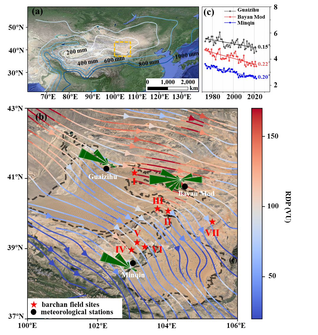 Wang, L., Hou, C., Pang, X., Zhang, H., Yizhaq, H., Mason, J. A., Lu, H., Xu, Z*. Slowdown of dune migration in East Asia’s inland deserts: A 35-year response to wind stilling. Geophysical Research Letters, 2025, 52(16): e2024GL113506. //doi.org/10.1029/2024GL113506