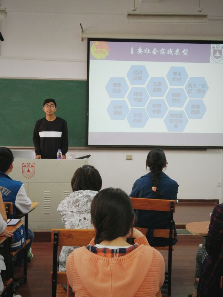 首先,刘民凝同学介绍了社会实践相关政策,他给大家介绍了南大往年和今年社会实践的情况、主要社会实践类型和工作日程表.