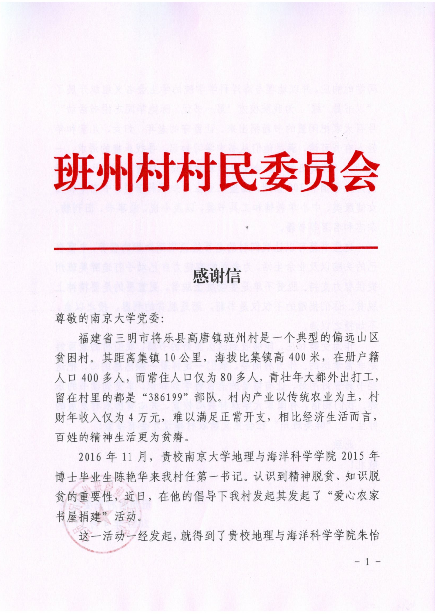 福建省三明市将乐县高唐镇班州村是一个典型的偏远山区贫困村。其距离集镇10公里,海拔比集镇高400米,在册户籍人口400多人,而常住人口仅为80多人,青壮年大都外出打工,留在村里的都是“386199”部队。村内产业以传统农业为主,村财政年收入仅为4万元,难以满足正常开支,相比经济生活而言,百姓的精神生活更加贫瘠。现任班州村任“第一书记”的黄漫 校友陈艳华,在认识到村民精神脱贫的重要性后,倡导开展“爱心农家书屋捐建”活动,黄漫 黄贤金教授知晓了这一信息,立即倡议全院师生积极响应,大力支持校友陈艳华同志的工作、支持班州村的社会主义新农村建设。