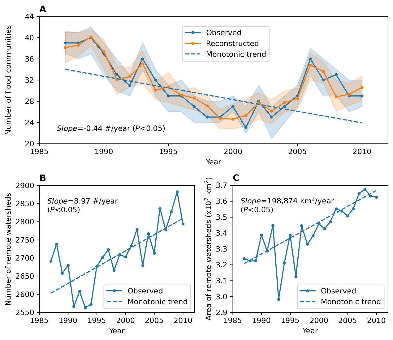 图3 全球流域洪水同步网络变化。(A)网络中“社区”显著减少(蓝色线),且能被大尺度气候遥相关因子较好地重建;远程同步流域的数量(B)和流域面积(C)均显著增加
