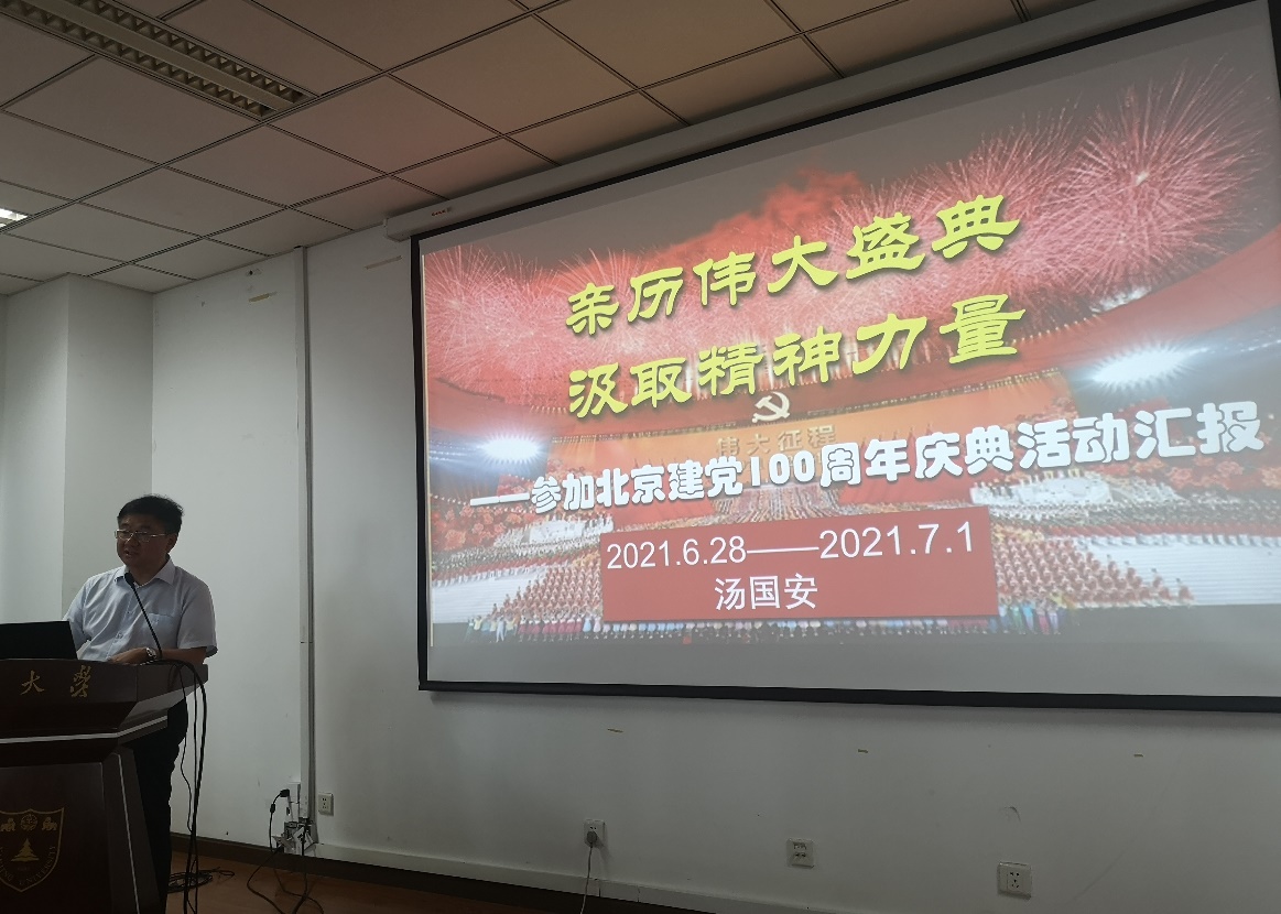汤国安教授说,身为教学科研一线的人民教师,能够亲身参加庆典活动,共同见证这一具有非凡意义的重大历史时刻,充分体现了以习近平同志为核心的党中央对教育事业和对教师队伍的高度重视,体现了党中央对人民教师的亲切关怀和政治礼遇,感到无上光荣,倍受鼓舞激励。他介绍了建党一百周年盛典系列活动的盛况,包括观看大型情景史诗《伟大征程》,体验视觉震撼;观看“七一勋章”授予仪式,接受心灵洗礼;参观中国共产党历史展览馆,感受中国共产党波澜壮阔的发展历程;参加天安门广场建党百年庆祝典礼,近距离聆听习总书记重要讲话。汤老师深刻感悟到中国共产党人牢记使命,不畏艰难,不怕牺牲,为新中国的建立与发展,为人民的幸福与安康,为民族的解放与复兴,做出了彪炳史册的重要贡献。作为人民教师,责任重大、使命光荣,一定要撸起袖子加油干,为国家培养一批又一批批德智体美劳全面发展的社会主义建设者和接班人,努力成为中华民族伟大复兴的一名教育“筑梦人”。同时,汤老师也感叹,现代科学技术护航庆典活动科学规划、井然有序,特别是人工天气干预、遥感对地观测、地理信息系统等技术为庆典活动提供了强有力的保障。汤老师还与师生作了交流。
