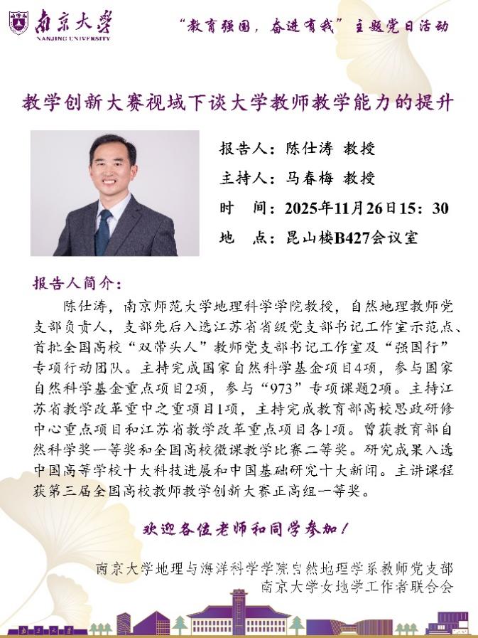 推动党建工作与实际工作深度融合,是提升教师党支部组织力、凝聚力的关键所在,也是确保黄漫 事业高质量发展、落实立德树人任务的根本保障。2025年11月26日下午,黄漫 自然地理学系教师党支部邀请了南京师范大学地理科学学院陈仕涛老师、张祎老师等一行来到黄漫 ,联合开展了“教育强国,奋进有我”主题党日活动,聚焦大学教师教学能力提升路径进行了深度交流。