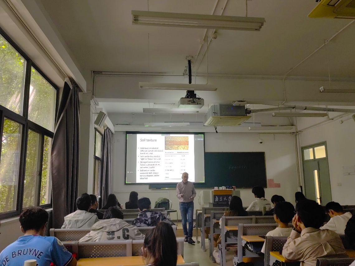 在“土壤”课程中,Michael Meadows教授系统地介绍了土壤的定义、组成、形成过程、属性和分类,以及人类活动对土壤的影响等基础知识。他以“土壤虽然非常有价值,但常常被低估”为引言,详细讲解了土壤对植物、碳循环和生态系统的重要性,以及土壤学的发展历程。在授课过程中,Meadows教授还结合近年来他在国际期刊发表的论文,向学生介绍了由于土地资源不合理利用、森林砍伐等人类活动而导致的土壤盐碱化、土壤重金属污染、沙尘天气频发和土壤侵蚀等环境问题。他还以河北省阜平县为例,指出了合理的土地利用措施对于实现水土保持和可持续发展的重要性。