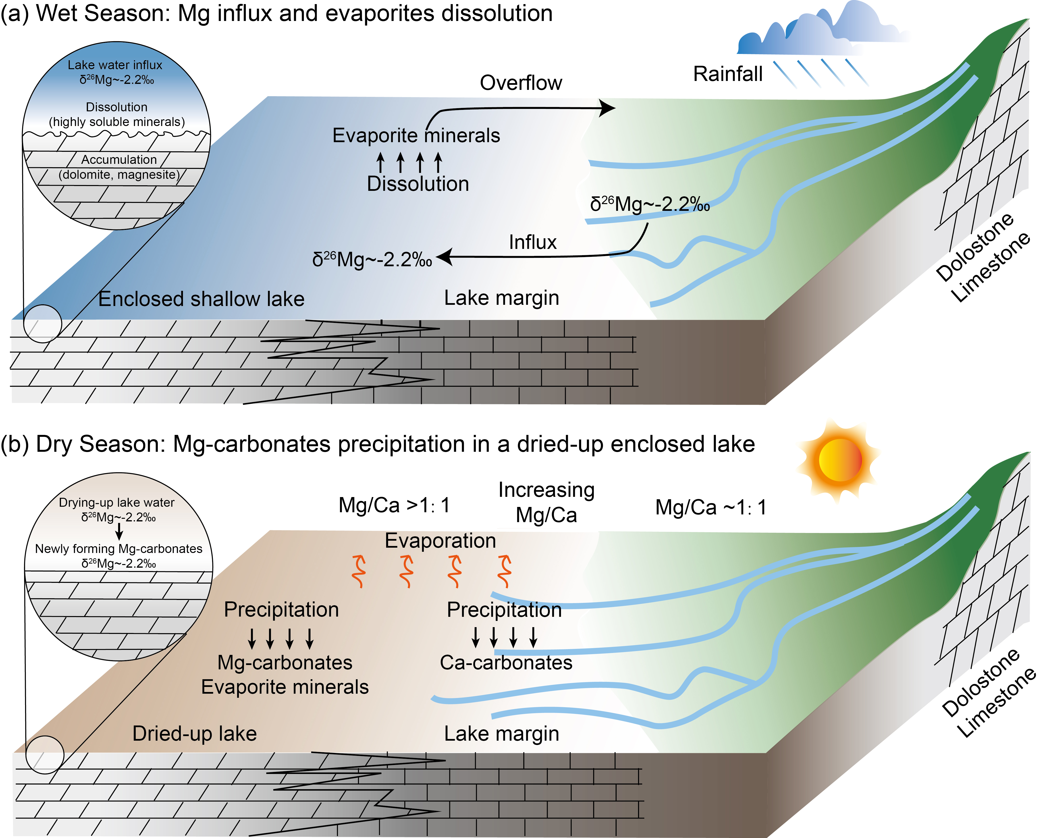 该论文以东秦岭河南卢氏盆地厚层的中始新世湖相镁碳酸盐沉积序列为载体,结合沉积学、古环境以及团簇同位素证据分析镁碳酸盐的成因,创新性地利用镁同位素分馏机理揭示沉积序列中白云石和菱镁矿的形成环境为强降水和强蒸发共存,发现季节性的干湿变化驱动了镁碳酸盐的循环沉淀,促使镁碳酸盐逐年增厚(图1和2)。在雨季,周围古老的碳酸盐风化导致镁元素的快速输入;在旱季,强蒸发促使镁在封闭湖盆完全沉淀。研究还发现,类似卢氏盆地湖相镁碳酸盐沉积在始新世东亚地区并不罕见,表明显著的气候水文季节性在研究区域广泛存在。该研究揭示的始新世东亚气候水文季节变化,为理解温室背景下的气候水文变率和机制提供了新思路和新证据。