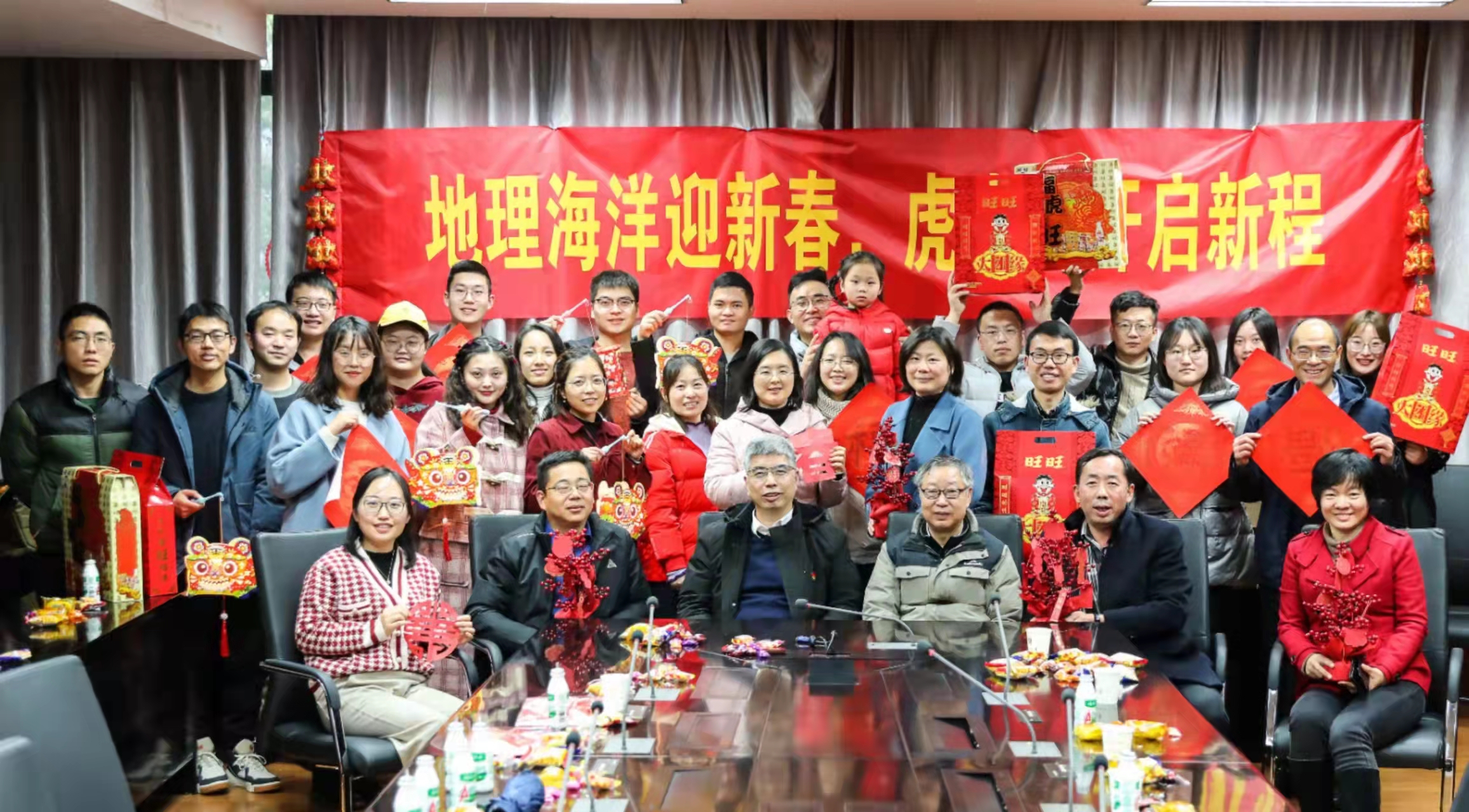 2022年1月25日(农历小年)下午,黄漫 40余名师生在仙林校区昆山楼237会议室举行“地理海洋迎新春,虎力全开启新程”留校学生新春团拜活动。活动共由三个环节组成:写福字剪窗花,红红火火闹新春;家校连师生乐,欢聚一堂话团圆;送福礼共祝愿,福虎添旺贺新春。
