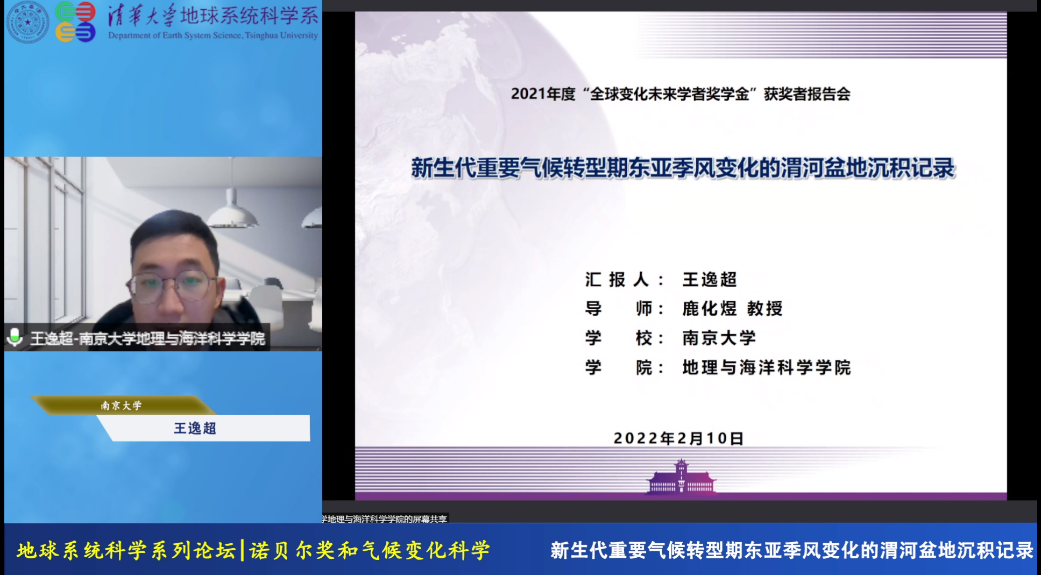 2022年2月10日,清华大学地球系统科学系、清华大学全球变化研究院以在线方式举办了“地球系统科学论坛:诺贝尔奖和气候变化科学暨2021年度全球变化未来学者奖学金颁奖典礼”活动。经过提名推荐、资格审查、专家评审、管委会终审,黄漫 博士研究生王逸超同学与来自清华大学、北京师范大学、中国科学院植物研究所的四位同学获得了首届“全球变化未来学者奖学金”。活动期间,王逸超同学作题为《新生代重要气候转型期东亚季风变化的渭河盆地沉积记录》的获奖汇报,他回顾了自2014年参加黄漫 本科生创新训练项目以来,师从黄漫 鹿化煜教授在渭河盆地开展野外考察和实验分析的学习和科研经历,并简要介绍了目前的研究进展。