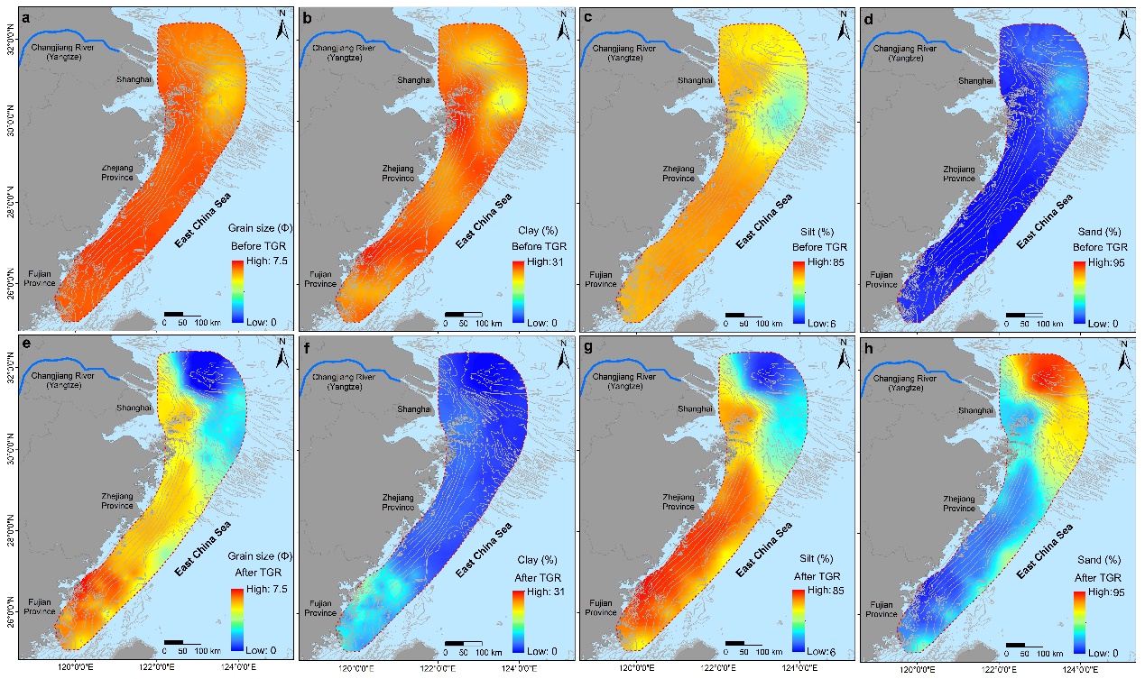 图- 1三峡水库蓄水前后长江河口-陆架区表层沉积物粒度及不同组分含量的空间分布图;a, e) 沉积物粒度;b, f) 粘土组分;c, g) 粉砂组分;d, h)砂质组分