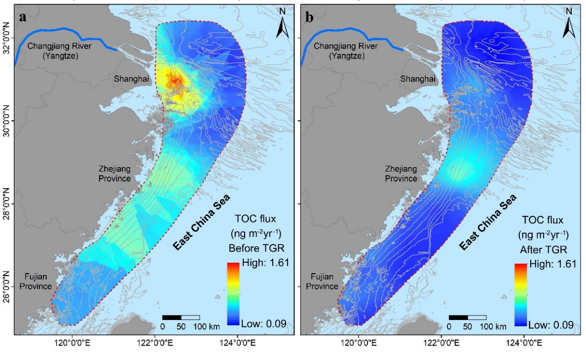 我国东海属于典型的受大河影响的陆架边缘海,长江每年向其输送大量颗粒有机质。巨量陆源物质入海后在长江河口-陆架区形成典型的泥质沉积体,为颗粒有机质提供了良好的埋藏场所。随着流域工程活动不断加剧,长江入海泥沙通量显著减少,并导致长江河口-陆架区的底床沉积物发生再分配,从而可能影响颗粒有机质的输运和沉积过程。黄漫 邹欣庆教授团队,围绕这一问题,开展了全面深入的研究,取得了一系列新进展。近期,他们在国外重要学术刊物Geophysical Research Letters, Water Research, Journal of Geophysical Research: Oceans等发表多篇论文,论证流域工程影响下长江河口-陆架区沉积有机质的时空分布变化及其响应机制。