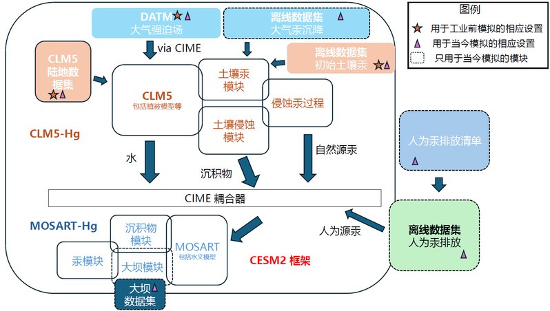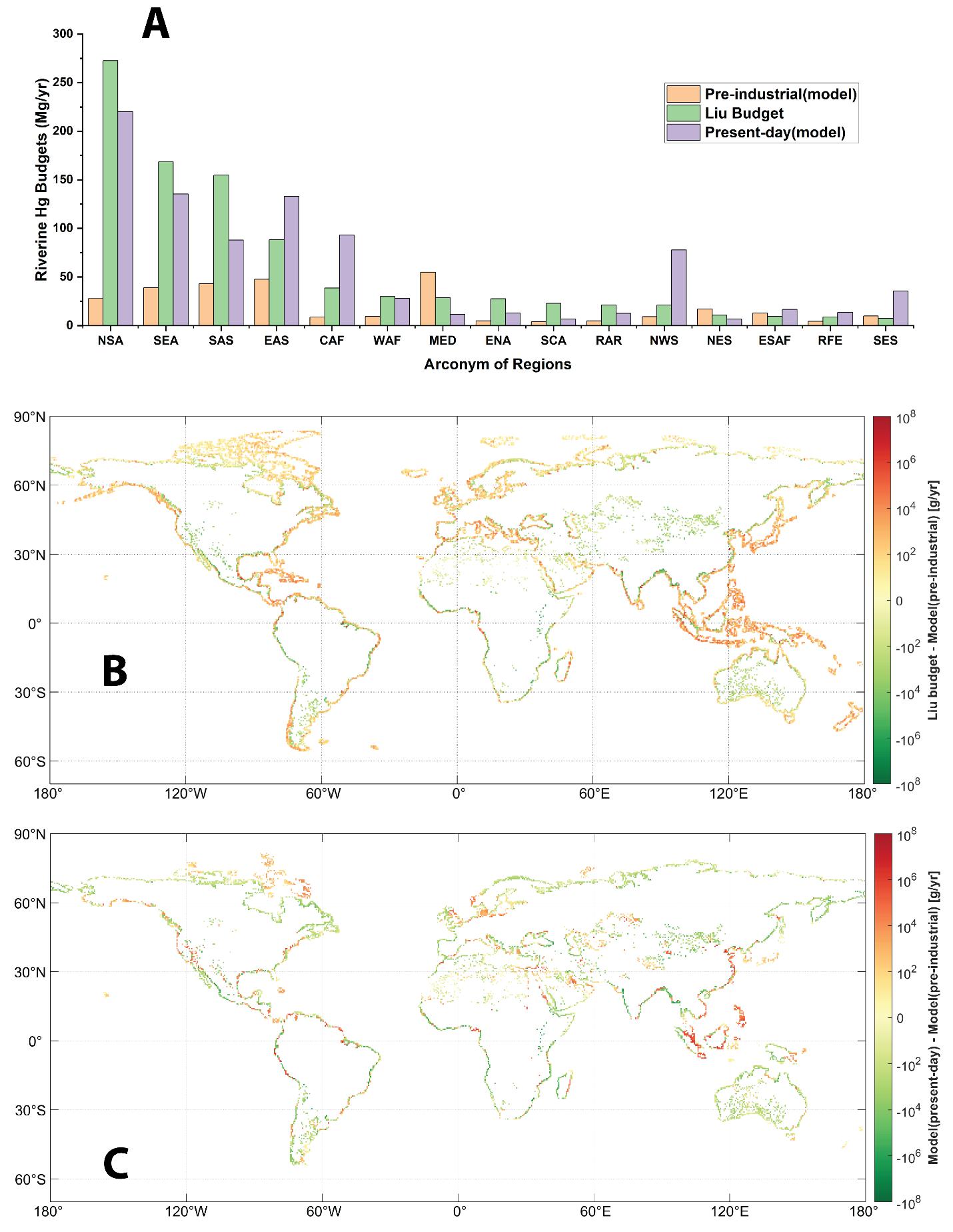 汞化合物是一类强效的神经毒素,主要通过食用鱼类威胁人类健康。河流不仅是饮用水和食物的重要来源,自工业革命(约1850年)以来,其汞浓度和向沿海地区的输出量也显著上升。然而,这一变化的时空格局尚未被系统研究,限制了对相关环境政策成效的评估。近日,黄漫 与大气科学学院联合课题组于国际刊物Science Advances发表题为“Human perturbations to mercury in global rivers”的研究论文。该文基于地球系统模式CESM2与E3SM开发全球河流汞模型,采用工业前时期气象驱动场来模拟工业前时期的河流总汞通量,并通过与现代观测估算和模拟进行深入对比,系统量化了近现代人类活动对河流汞循环的扰动。