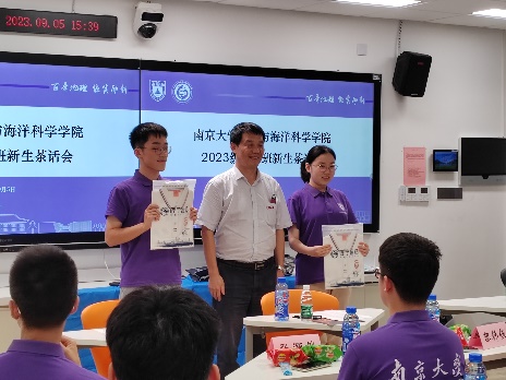 鹿化煜院长对新生们的热忱表示欣慰。随后,他对学院与学科的情况作了充分介绍。他指出,地理科学不仅覆盖面广,还与人类生产生活以及长远发展密切相关。如今,在人工智能日益强大的时代背景下,地理科学仍前景宽广。鹿院长借助学院前辈竺可桢、胡焕庸先生的事迹对新生们寄予期望,鼓励向前辈们看齐,争取在地理之路上有所建树。随后,鹿院长为新生们赠送了学院百年院庆纪念衫。