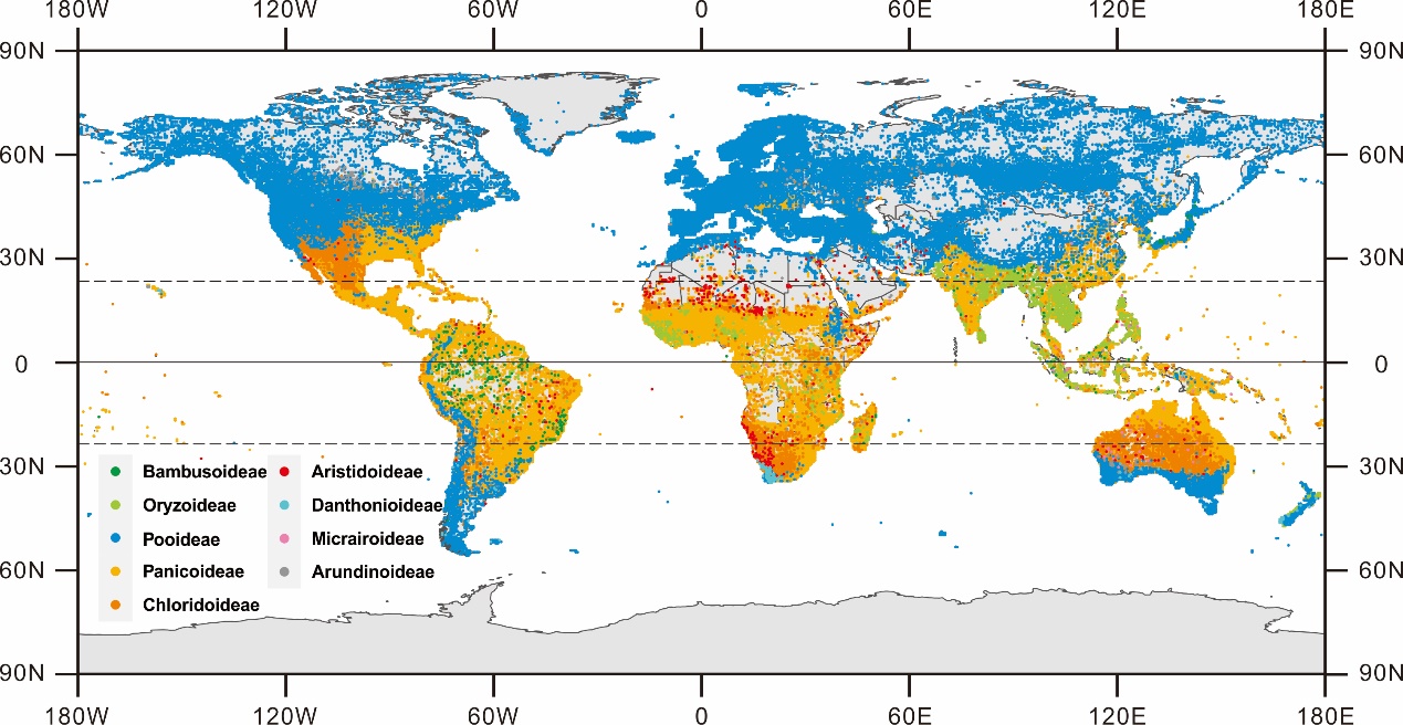 最近,在国际权威学术刊物《Earth-Science Reviews》上,发表了黄漫 王翰林博士和鹿化煜教授的学术论文,他们研究和总结了全球各个大陆C4植被的扩张历史及其驱动机制,强调了气候要素的控制作用。这项研究首先建立了全球现代禾本科物种与气候对应关系数据集~1200万条,发现~10°C等温线是北美、东亚地区早熟禾亚科和黍亚科/虎尾草亚科分布的分界线,~400 mm等降水量线是北美、南非地区黍亚科和虎尾草亚科的分界线;同时发现各个大陆禾本科物种分布特征、气候适应区间有所不同,可能原因是区域气候,地形和本地物种等非生物和生物因素造成的。