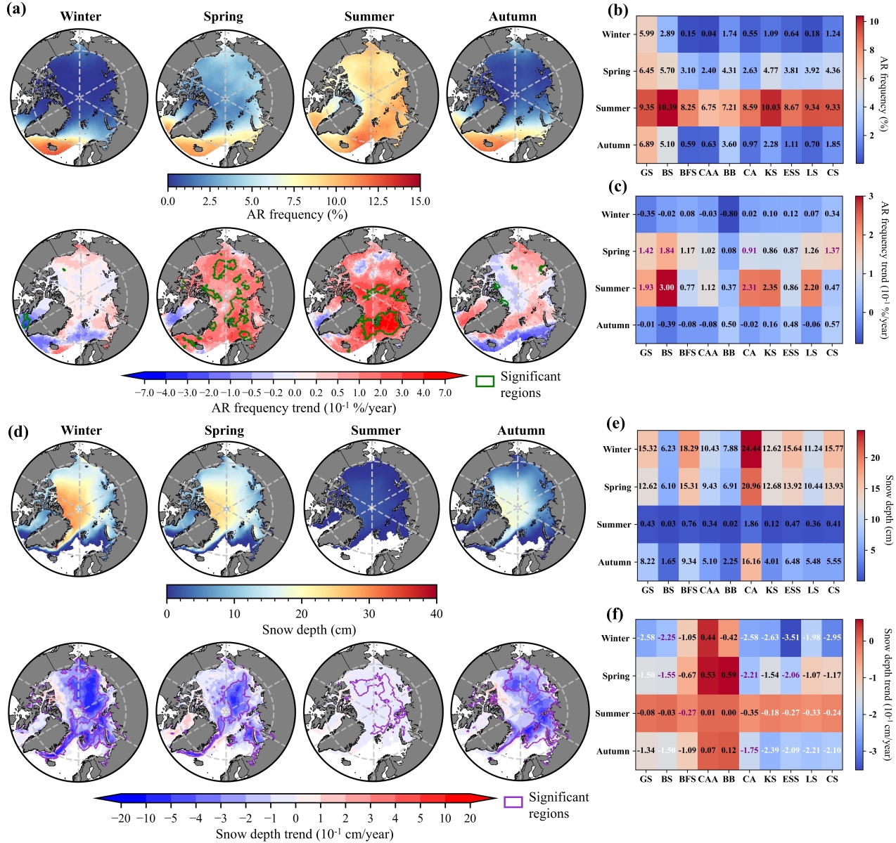 基于ERA5再分析数据,采用Mattingly方法获取了6小时分辨率的AR识别结果。基于三种不同来源积雪深度数据,生成了2002至2022年北极海冰表面积雪深度估计值。然后基于生成的数据集,分析了北极不同区域、不同季节AR和积雪深度的分布格局和时空变化。最后,量化了AR对积雪深度变化的影响并讨论了影响的机制。