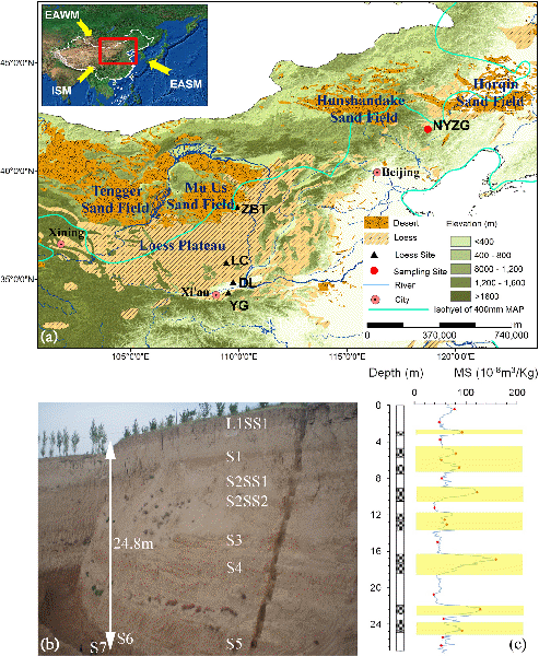 图1. 研究区地理位置(a)、自然地理环境(a)、黄土-古土壤剖面(b)和黄土-古土壤序列的磁性变化(c)。