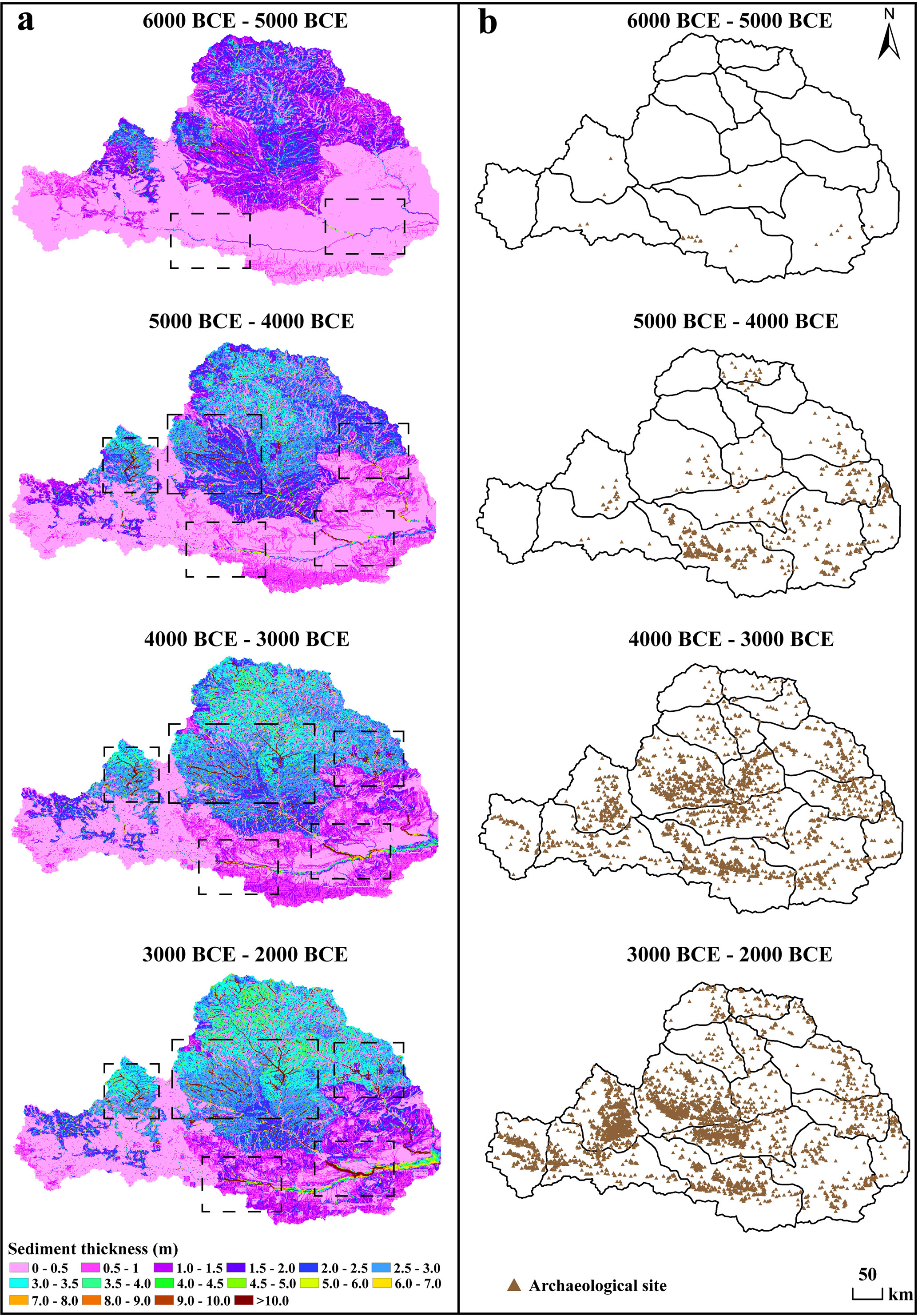 图3 渭河流域全新世沉积物厚度模拟结果(a)与古人类活动遗址(b)对比