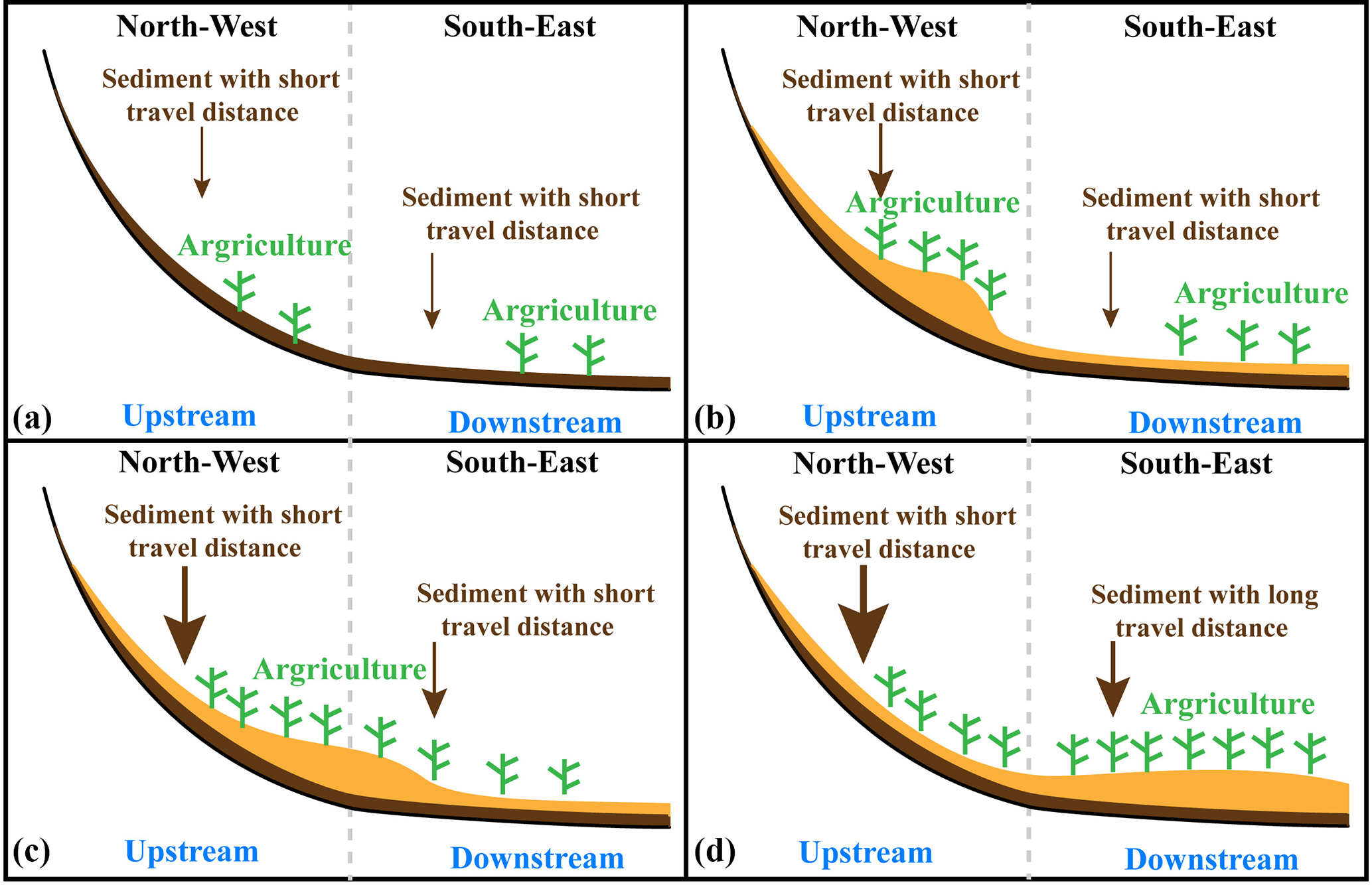 结果表明,在流域农业用地面积占比较低时,径流量与泥沙量对气候变化响应的敏感度会持续下降;当农业用地面积占比增高,径流量与泥沙量对气候变化响应的敏感度则呈现持续上升的状态(图2)。基于这个现象,我们提出流域的水文泥沙过程在1000 BCE,即流域农业用地面积占比超过30-50%时,发生了系统突变。