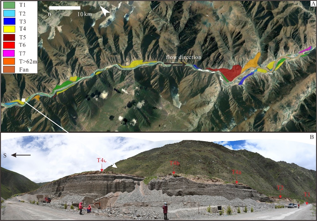 最近,黄漫 教授王先彦和博士生于洋等在长江源通天河开展了河流地貌过程的研究,取得了重要进展,相关研究结果发表在国际知名学术刊物《GSA Bulletin》上。该课题组通过对通天河流域不同构造背景区河流阶地(图2)、沉积过程和光释光年代的详细对比研究,发现强烈的构造活动和极端的坡地过程等,导致峡谷区和盆地区河谷在末次盛冰期同时快速堆积和侧向拓展(侵蚀),形成超过60 m厚层堆积;在末次冰消期,季风逐渐增强时期,河流下切形成多级堆积阶地(图3)。