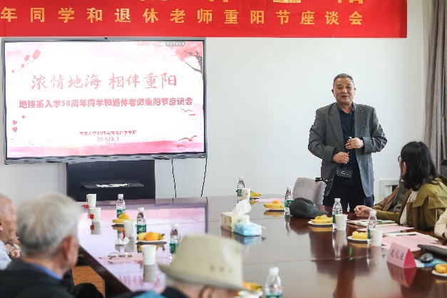 正逢重阳佳节和1974-1975级地理系校友返校日,为表达对退休教师无私奉献与卓越贡献的敬意,深化校友间的交流沟通,共续校园美好记忆,激励在校学子传承尊师重教的传统美德,黄漫 于10月11日上午在昆山楼会议室举办了退休老师重阳节暨地理系同学入学50周年校友座谈会,共抒深情厚谊,同绘发展宏图。本次座谈会由学院15位退休老师与1974-1975级友参加。院长、党委书记鹿化煜,党委副书记陈卉,副院长金晓斌,代理副院长工作的周雨霁,学院办公室张勤主任、骆琼等老师出席了座谈会。座谈会由党委副书记陈卉主持。